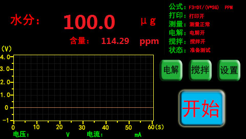 After sampling, click the "start" button, the instrument shows the status of "titration", the sample is injected into the anode chamber through the sample feeding cock, the titration automatically starts, and the moisture value continues to increase.