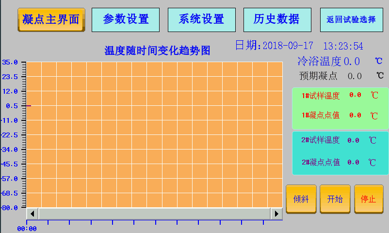 The main display area is the trend chart of the temperature of the sample changing with time, which can display the temperature value of the sample and metal bath. The right display area will display the specific value, and the lower part is the experimental results of the expected freezing point and test tube.