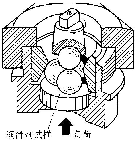 四球法是在四球試驗(yàn)機(jī)上測(cè)定潤(rùn)滑劑承載能力的一種方法。按照GB/T3142《潤(rùn)滑劑承載能力測(cè)定法(四球法)》,在四球極壓試驗(yàn)機(jī)上按等邊四面體排列著4個(gè)鋼球,上球以1400~1500r/min旋轉(zhuǎn),下面3個(gè)鋼球用油盆固定在一起,通過(guò)杠桿或液壓系統(tǒng)由下而上對(duì)鋼球施加負(fù)荷。在試驗(yàn)過(guò)程中,4個(gè)鋼球的接觸點(diǎn)都浸沒(méi)在潤(rùn)滑劑里。每一級(jí)負(fù)荷每次試驗(yàn)時(shí)間為10s,試驗(yàn)后測(cè)量油盒內(nèi)任何一個(gè)鋼球的磨痕直徑。按照規(guī)定的程序反復(fù)試驗(yàn),直到求出代表潤(rùn)滑劑承載能力的指標(biāo),包括最大無(wú)卡咬負(fù)荷PB,燒結(jié)負(fù)荷PD等。