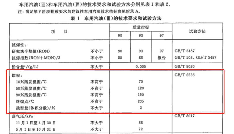 標(biāo)準(zhǔn)餾程的10%的蒸發(fā)溫度要求不高于70度,終餾點(diǎn)不高于205度。