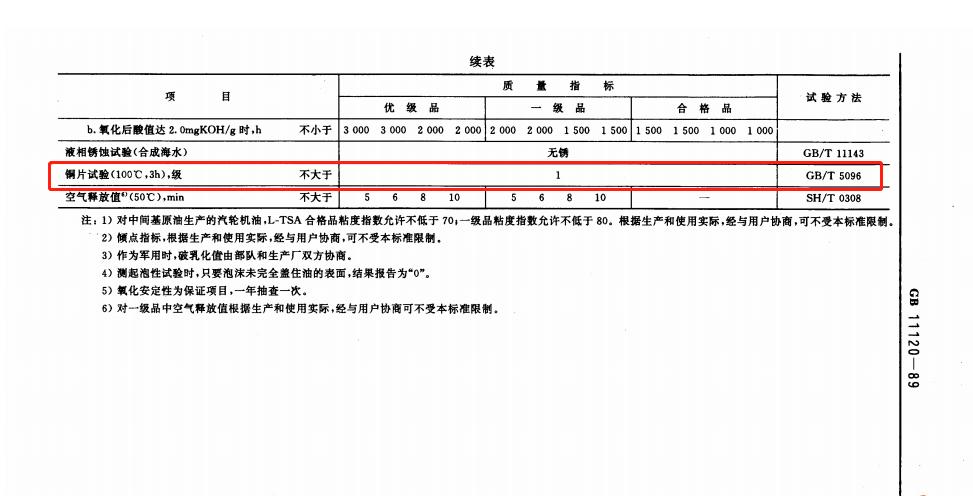 汽輪機油GB 11120-1989L-TSA中銅片腐蝕要求不大于多少?