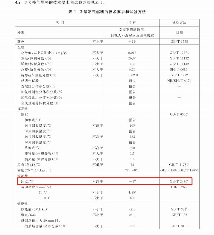 根據(jù)GB6537噴氣燃料的標準要求,冰點的要求是不高于-47℃。