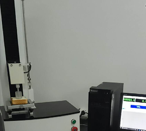 2、 面包樣品的切片方法 采用自制面包切片器配合專用面包刀進行面包切片,每個面包樣品先切除一端的兩片12.5mm的面包片,然后切出3片25mm厚的面包片作為測試樣品。面包片樣品依次放置在質構測試儀的測試平臺上,并使面包片樣品中部與質構測試儀探頭中心對準即可進行質構測試。