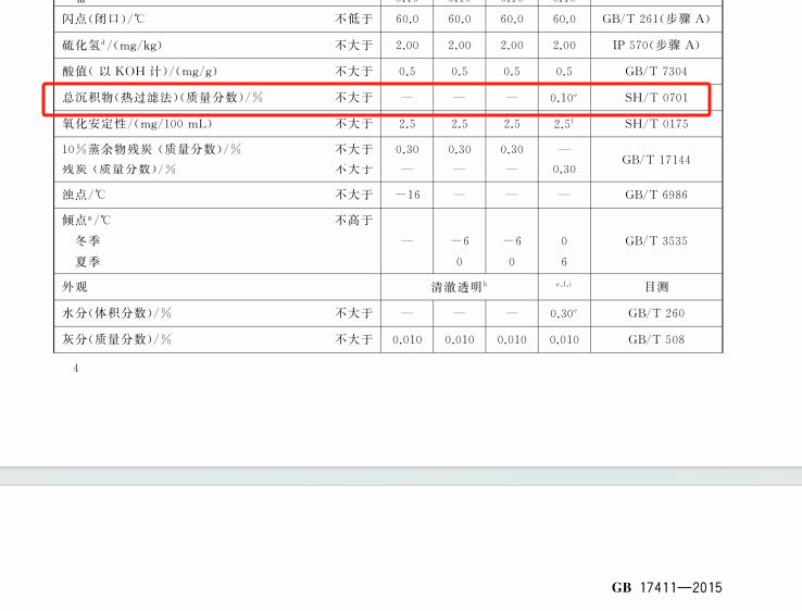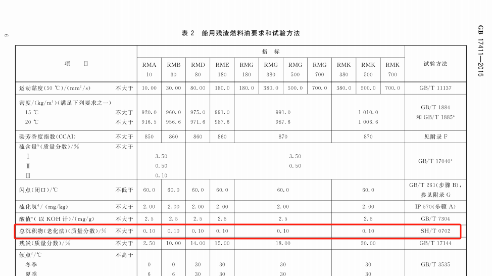 根據(jù)標(biāo)準(zhǔn)GB17411中規(guī)定,船用餾分燃料油的總沉積物的檢測(cè)是按照SH/T0701標(biāo)準(zhǔn)方法來(lái)測(cè)定,船用殘?jiān)剂嫌偷目偝练e物(熱過(guò)濾法)的檢測(cè)是按照SH/T0702標(biāo)準(zhǔn)方法檢測(cè)的。如下圖: