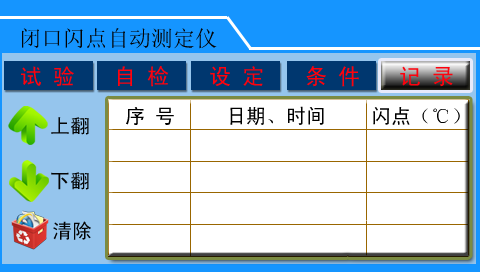 該界面顯示已測試樣的測定結(jié)果試驗記錄。“上翻”、“下翻”按鈕用以翻頁查詢,“清除”按鈕用于清空記錄存儲區(qū)的所有數(shù)據(jù)記錄—點擊“清除”后彈出確認清空記錄窗口,避免因誤操作而意外刪除所有的試驗記錄。