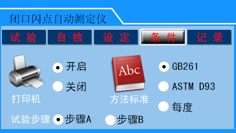 該界面用以設(shè)置打印機的開啟、關(guān)閉及測試試樣所符合的標準、采用國標時根據(jù)樣品分類而采用的不同測試步驟等。采用的標準包括GB261-2008和ASTM D93,設(shè)定為“每度”時,測試試樣開始后,在溫度上升約5℃時,每升高1度即開蓋并點火一次,試驗試樣是否閃火,適用于并不確知閃點范圍的試樣。選擇“步驟A”時,按GB/T261-2008要求的步驟A測試方法測試樣品;選擇“步驟B”時,則按GB/T261-2008要求的步驟B測試方法測試樣品。