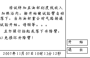 按樣品測試鍵進入樣品測試工作界面,見圖7所示。將干燥試樣杯加入試樣放入加熱浴內,需要開始時按開始鍵,升降臂